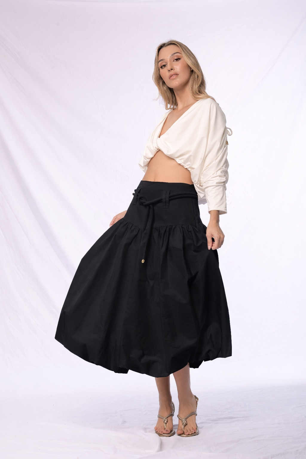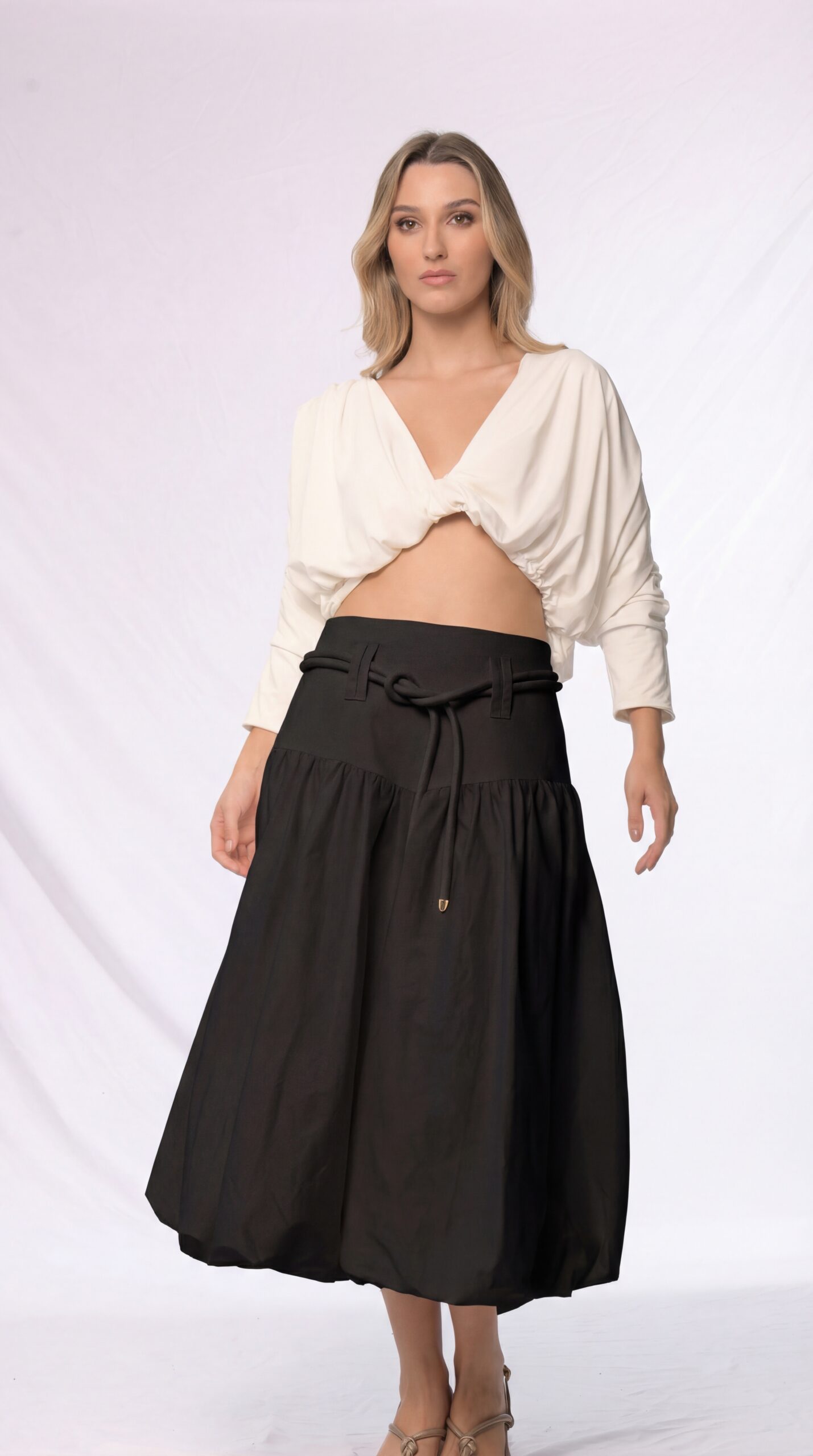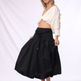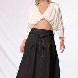 Una silueta suave, envolvente y con movimiento natural. Esta falda globo que destaca por su diseño romántico y estructurado a la vez. La pretina ancha acentúa la cintura, mientras que el volumen recogido en la parte inferior crea una forma orgánica y femenina que evoca libertad y fluidez. Confeccionada en algodón liviano, es perfecta para transitar con elegancia entre lo cotidiano y lo especial. Llévala con tops ajustados o blusas vaporosas para un look etéreo y sofisticado.
